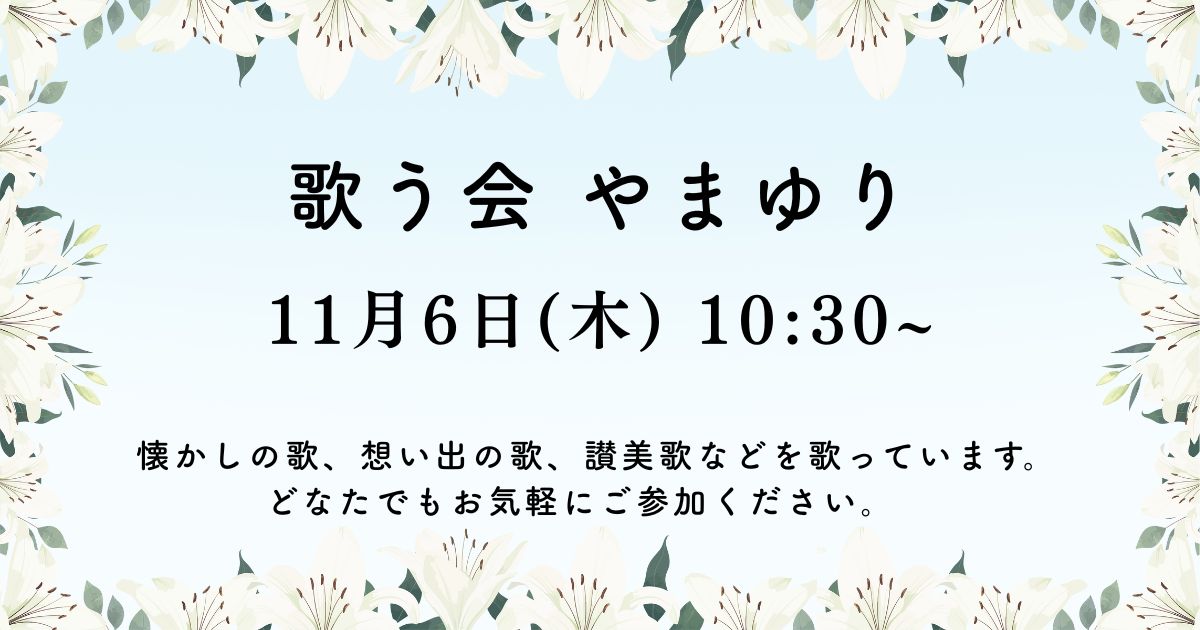 歌う会やまゆり(隔月) | 各月 10:30〜11:40 | 地域の方々と心地よく声を出し、共に楽しく歌うための集いの場として活動しています。 |