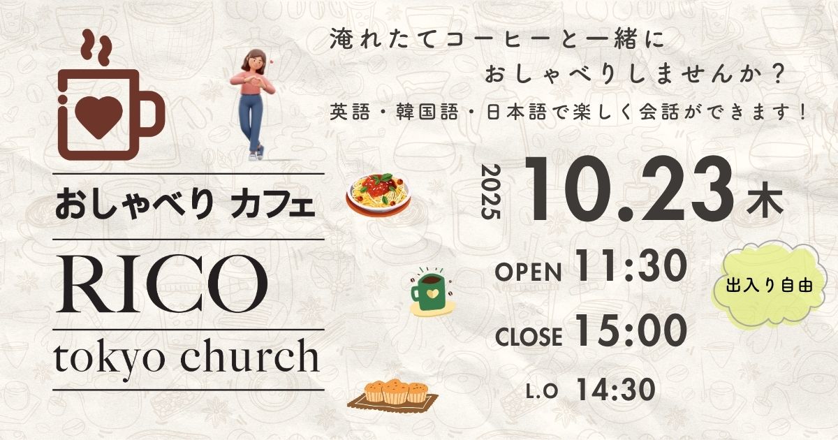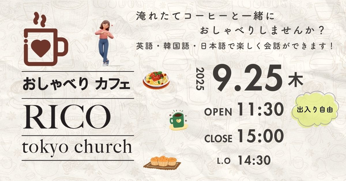 おしゃべりカフェ Rico | 毎月 11:30〜15:00 (出入り自由) | 言語を学びながら話したい方、1人でホッと一息つきたい方、 どなたでも歓迎します。 美味しいコーヒーと軽食を用意しています。 |