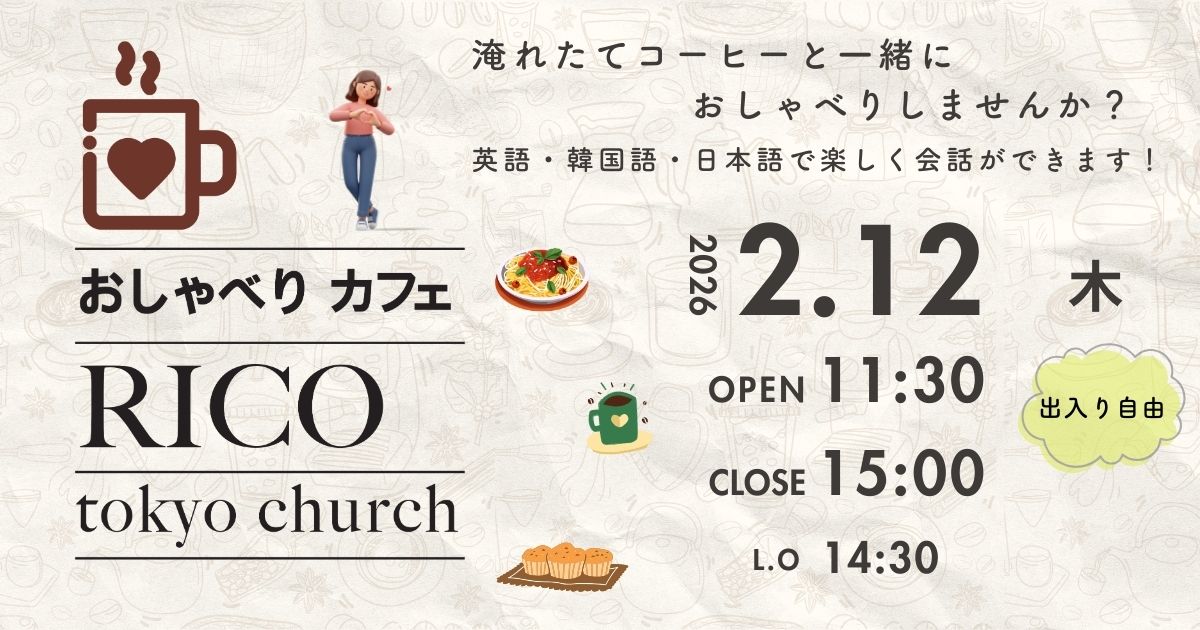 | おしゃべりカフェ Rico | 毎月 11:30〜15:00 (出入り自由) | 言語を学びながら話したい方、1人でホッと一息つきたい方、 どなたでも歓迎します。 美味しいコーヒーと軽食を用意しています。 |