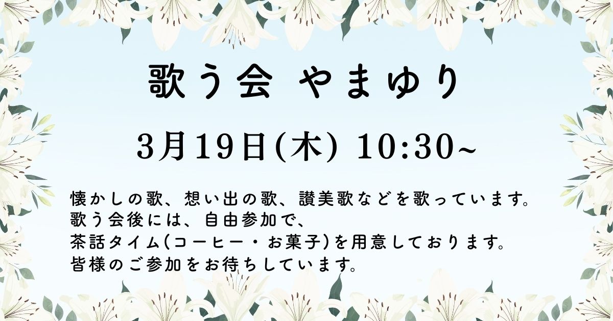 | 歌う会やまゆり(隔月) | 各月 10:30〜11:40 | 地域の方々と心地よく声を出し、共に楽しく歌うための集いの場として活動しています。 |
