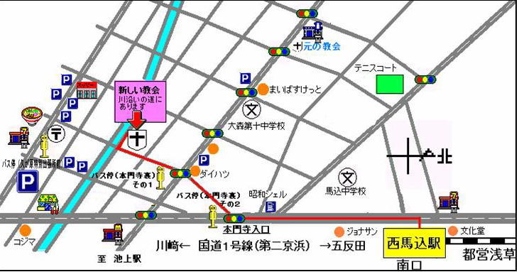 車の場合 | 「首都高目黒線戸越」で降ります。 国道1号線横浜方面に10分くらいです。 教会には1台分の駐車場あります。 |